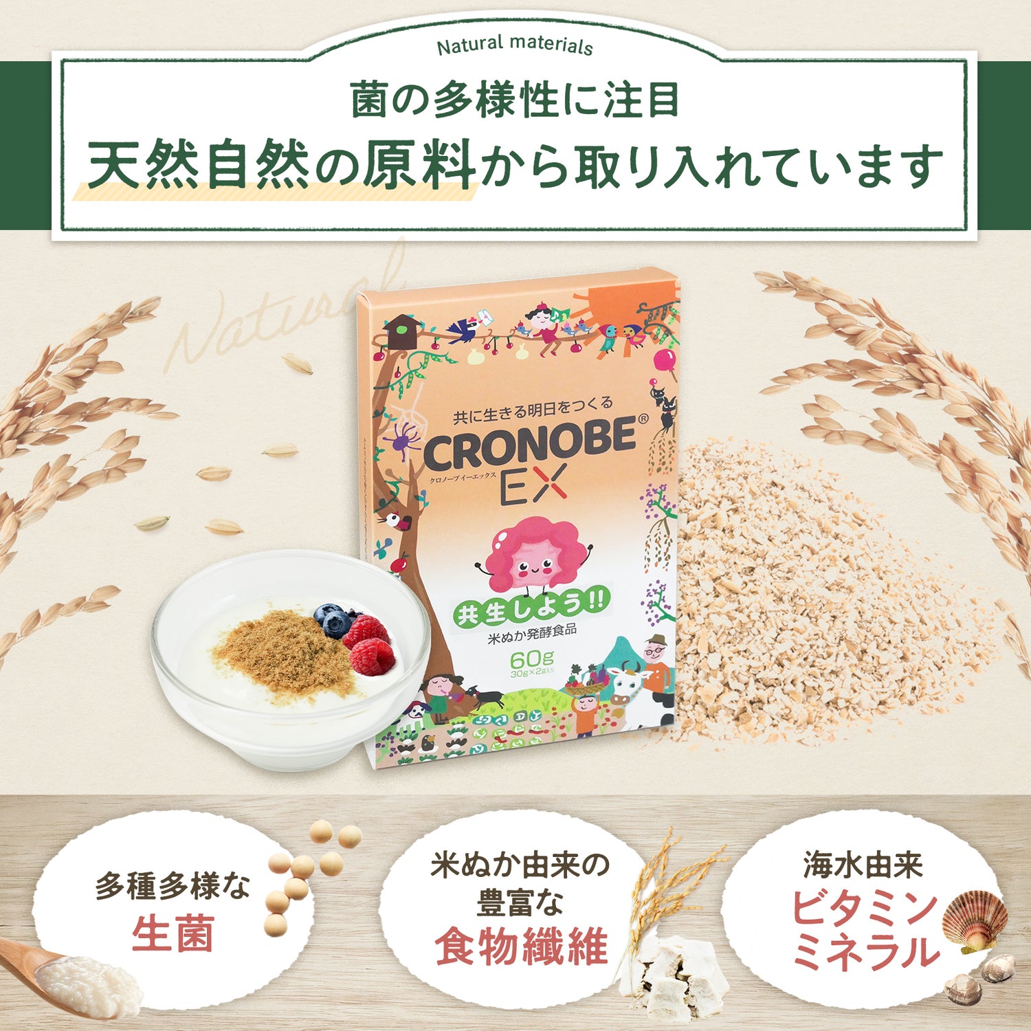 「単独の菌の作用に期待するのではなく、複数の生菌が共生する生態系を、まるごと取り入れること」がクロノーブの役割です。