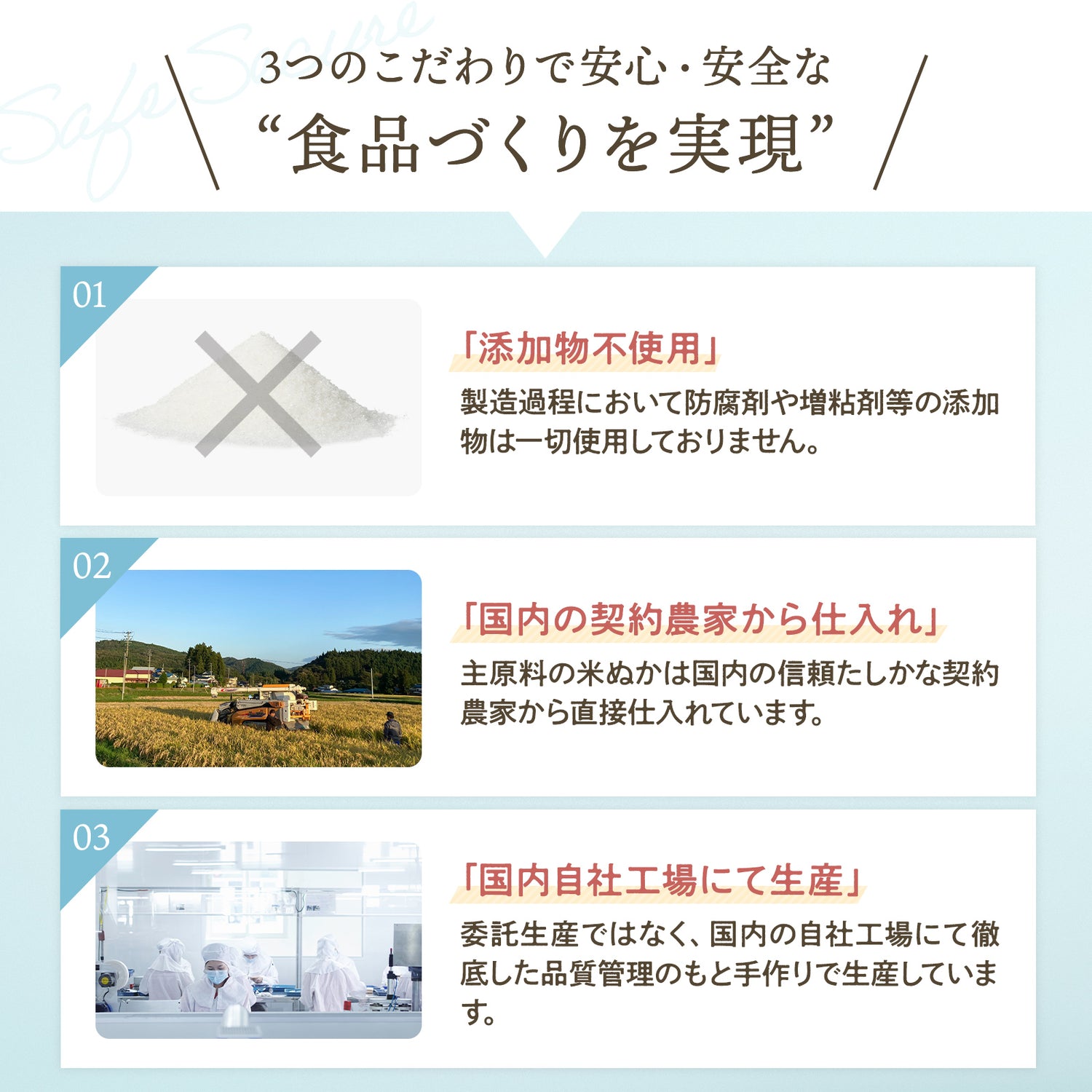 一切の化学物質を配合せず、信頼できる契約農家から入手した原材料から国内食品加工工場にて手作業で作られています。