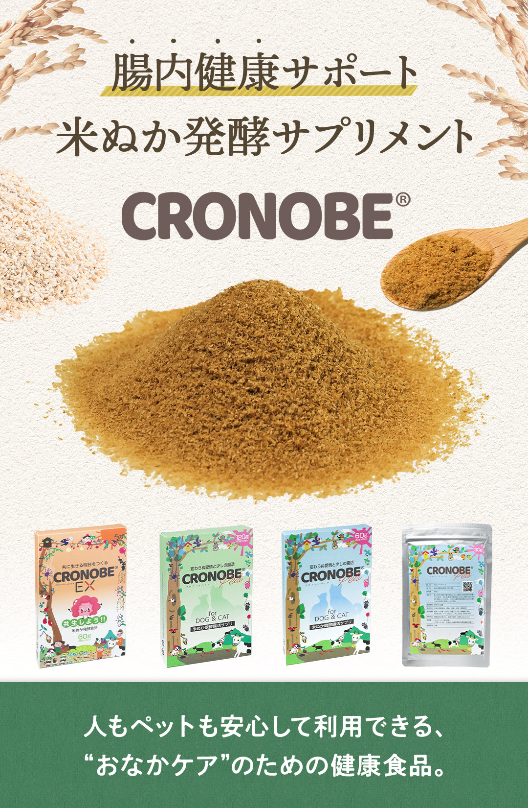 クロノーブは人・動物の腸管内に自然界(土壌)由来のバランスの良い微生物叢を丸ごと補い、増やし腸内環境を自然に近づける米ぬか発酵混合飼料です。